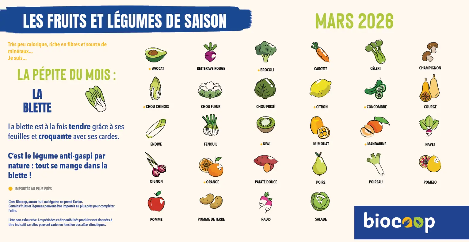 Parce que manger des produits de qualité rime avec respect de la saisonnalité, Biocoop a élaboré un calendrier de saisonnalité pour ses fruits et légumes bio.